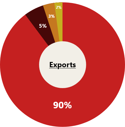- Export destinations: NE/SE Asia ~90%; Americas ~5%; Indian sub-continent ~3%; Europe ~2%